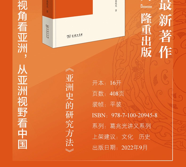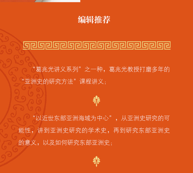 本書為“葛兆光講義系列”之一,是作者2011年後為博士生開設“亞洲史的研究方法”課程的講稿,經過十年以上的講述,並反復修訂增補後成書。全書分為四單元十三講,從亞洲史研究的可能性,東西方有關亞洲史的學術史,重點講到近世東部亞洲海域史的研究,並且詳細介紹近世環東部亞洲海域歷史的相關文獻。本書的重點,是通過案例討論亞洲史研究的途徑,也討論如何既把中國史放在亞洲史的大背景中,又從中國角度觀察周邊,進一步通過中國、東部亞洲海域、整個亞洲,理解歷史的交錯、聯繫和融匯。每個單元都以“問題”開始,討論亞洲史研究的必要性,以“討論”結尾,作為進一步研究的起點,最後給出建議閱讀的論著目錄。可以說,這不僅僅是一門針對研究生的歷史課,而且是有關區域史研究的方法論。