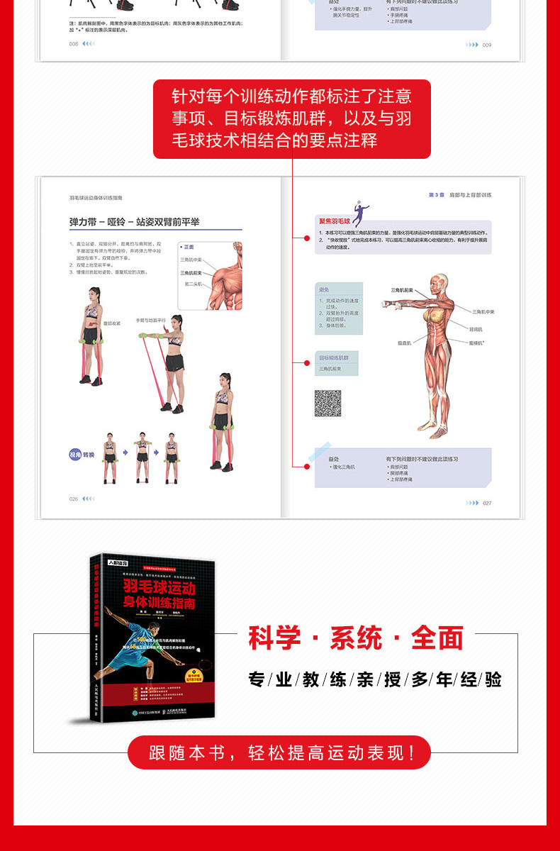 優秀的身體素質是技術水平得以良好發揮的必要支撐。 《羽毛球運動身體訓練指南》針對羽毛球運動提供了適合手臂、肩部與上背部、胸部、軀幹、臀部、腿部進行的練習動作,同時以分步驟圖解的方式講解動作要點,並配有關鍵步驟的動作解剖圖,以直觀的方式呈現訓練目標,幫助練習者有針對性地進行肌肉訓練,有效提昇運動水平。此外,《羽毛球運動身體訓練指南》針對每個訓練動作都標註了注意事項、目標鍛煉肌群,以及與羽毛球技術相結合的要點註釋,適合想不斷提高技術的羽毛球愛好者、專業運動員,以及致力於提升執教水平的教練員閱讀。