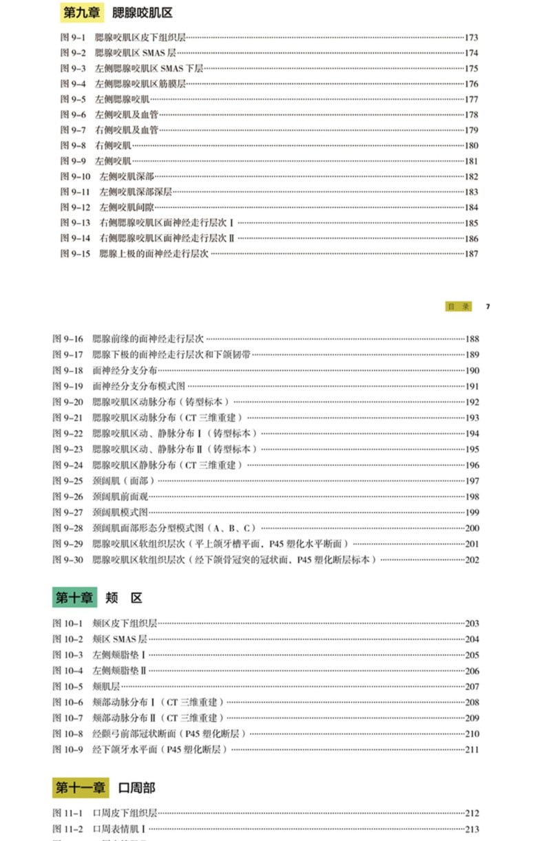 《面部精準注射解剖圖譜》是一本內容詳盡、標本層次結構清晰的實物圖譜。本書首先通過新鮮標本的動、靜脈灌注後,根據微注射的臨床需求在面部分部位進行了逐層解剖,拍攝了大量視角獨特的實用的實物照片,並且本書還利用血管鑄型技術、三維重建技術等獲得了面部動脈和靜脈分佈的全貌。 P45斷層塑化技術是的斷層標本製作技術,本書應用該技術清晰的顯示了面部的層次,尤其是完整的展示了SMAS層。同時本書繪製了精美的標本示意圖,使晦澀難懂的部分更加清晰。該書從籌備到完稿歷時1年半,*終精選照片、圖片240餘幅,圖譜內容詳實、圖片清晰、圖解充分,編排細緻,力求全面呈現面部的解剖層次和血管分佈,從而為面部微注射技術有效地提供解剖基礎。希望本書能夠成為廣大醫學生、醫學美容教育工作者和醫學美容臨床醫生的得力助手。