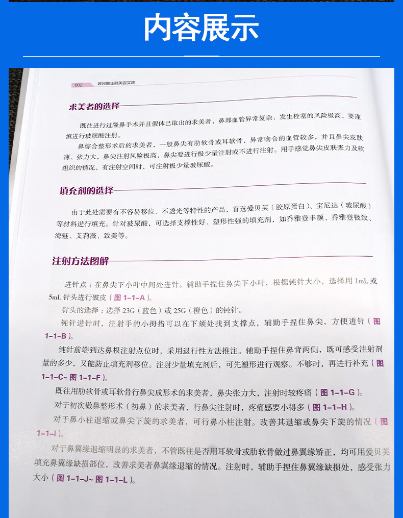 本書主要介紹了玻尿酸 注射的理論與實踐,全書分 為15章,詳細介紹了鼻部、 鼻唇溝、顳部、面頰、下頦 、蘋果肌、唇部、眉弓、淚 溝、精靈耳、上瞼凹陷、臥 蠶、額部、木偶紋、直角肩 的玻尿酸填充的具體操作, 每一章包括求美者的選擇、 填充劑的選擇、注射方法圖 解、操作步驟、注意事項及 案例展示,讓讀者通過閱讀 本書掌握玻尿酸注射的操作 及技巧。