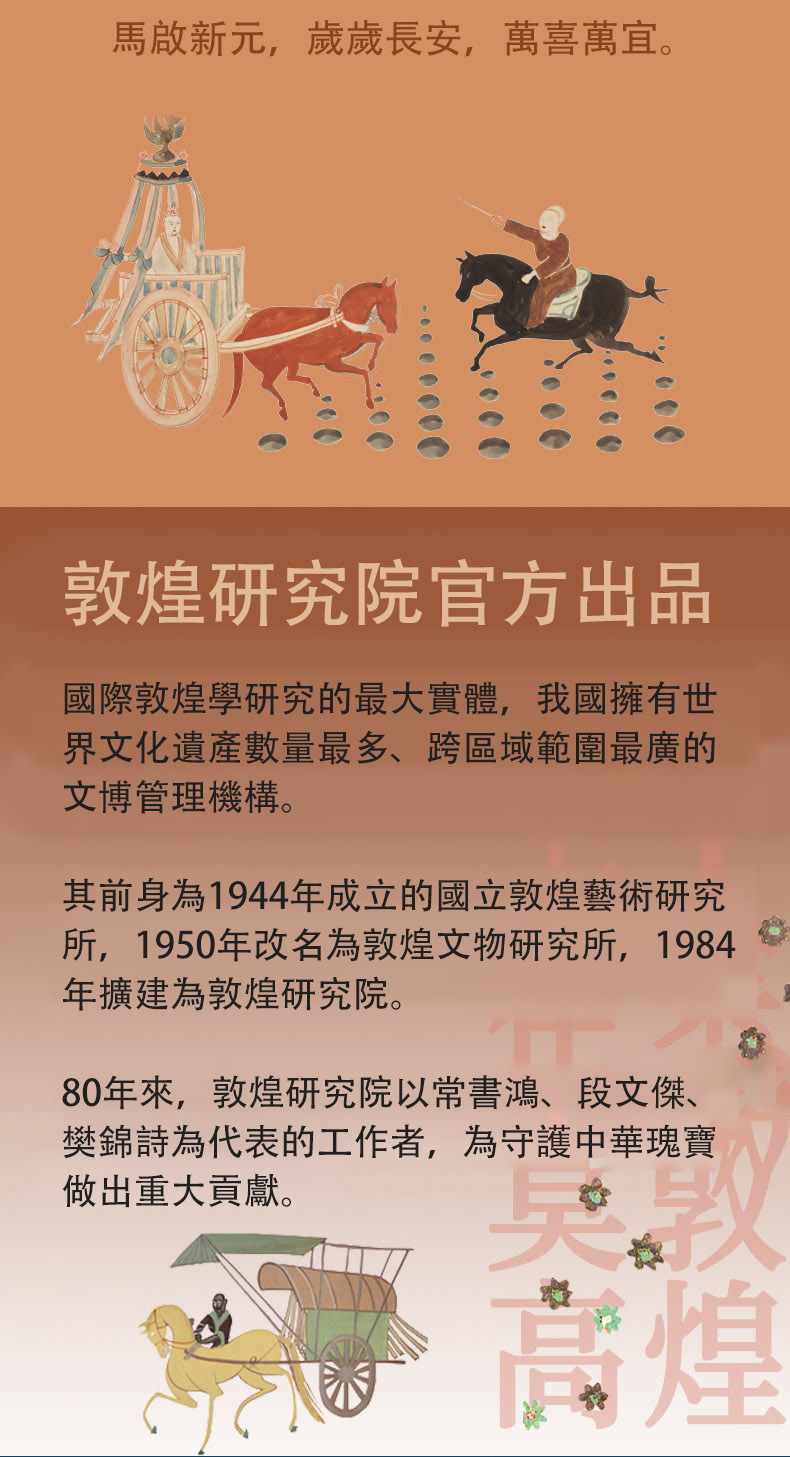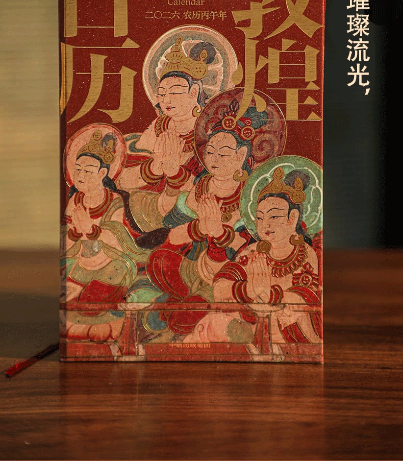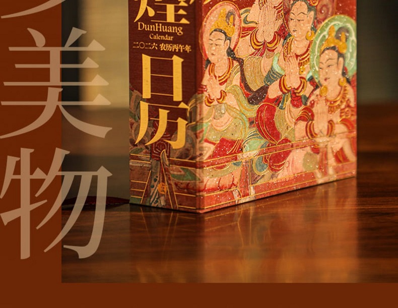 如是莫高,歲月凝光。璨然在壁,萬象奔來。敦煌研究院出品敦煌曆,2026年丙午馬年時序生輝。 甄選收錄335幅高清壁畫、30幅專家臨摹作品,特別選輯過往未公開的清晰細節。窮天下諫詭,盡人間麗飾。看天衣飛揚,滿壁風動,看琵琶弦上,落花成雨,看經變莊嚴,供養虔誠,看樂舞翩躚,法音繚繞,看菩薩低眉,金剛怒目,天女散花,力士擎天。 除夕日,莫高窟31窟《多寶塔》,聽塔鈴清響,新歲將至,圓滿遞增。 正月初一,莫高窟144窟《日天》,赤輪高懸,白馬踏春,日神乘坐五馬寶座,五駿馳騁,踏開一年新歲。 2 正月初五,榆林窟15窟《吐蕃財神》,瓔珞掛身,寶雨盈庭。 寒衣節,莫高窟202窟《樹上生衣》,願寒衣化暖,歲月生春。 冬至日,莫高窟156窟《舞樂圖》,瑞雪護佑,照破歲寒。 …… 既有佛國淨土,也繪人間百相。駝鈴叮咚,商賈往來雲集;青廬帳下,新人共牢而食;庖廚騰香,樂舞催宴;獵騎如風,羽箭穿雲;百戲雜陳,萬......