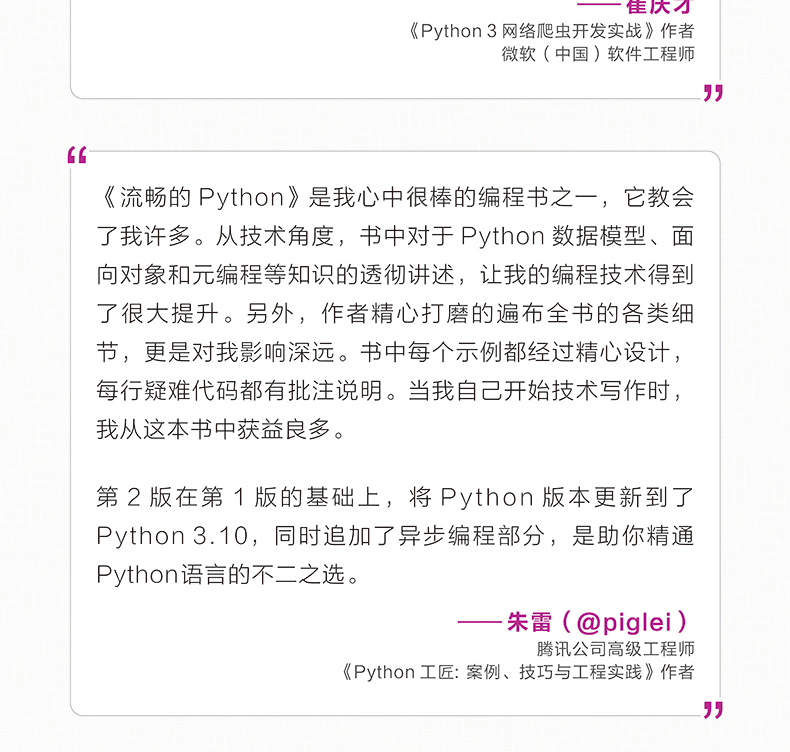 本書是Python領域備受推崇的經典作品,致力於幫助Python開發人員挖掘這門語言及相關程序庫的優秀特性,寫出簡潔、流暢、易讀、易維護,並且地道的Python代碼。本書著重講解Python語言所獨有的功能,助你成功進階為Python高手。第2版與時俱進,教你跳出舊有經驗,探索並運用地道的Python3功能。第2版主體內容分為五部分:數據結構、函數即對象、類和協議、控制流、元編程。每一部分都精彩紛呈,通過豐富的示例和細緻的講解,教你充分利用Python特性,寫出有效且現代的Python3代碼。對於所有想提升Python開發技能的讀者,本書不容錯過。