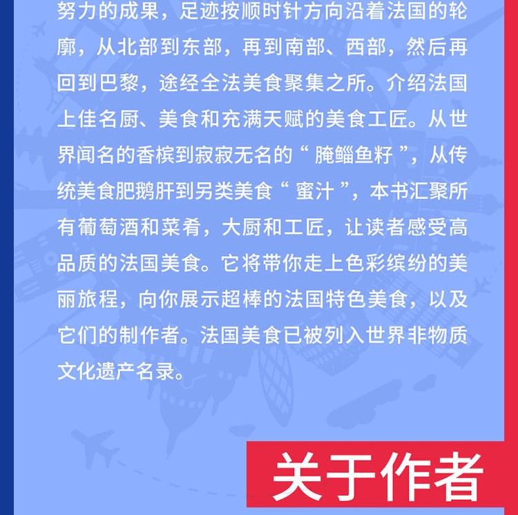 《法國美食之旅》是全法著名的美食作者三十年努力的成果,足跡按順時針方向沿著法國的輪廓,從北部到東部,再到南部、西部,然後再回到巴黎,途經全法美食聚集之所。介紹法國上佳名廚、美食和充滿天賦的美食工匠。從世界聞名的香檳到寂寂無名的“醃鯔魚籽”,從傳統美食肥鵝肝到另類美食“蜜汁”,本書匯聚所有葡萄酒和菜餚,大廚和工匠,讓讀者感受高品質的法國美食。它將帶你走上色彩繽紛的美麗旅程,向你展示超棒的法國特色美食,以及它們的製作者。法國美食已被列入世界非物質文化遺產名錄。