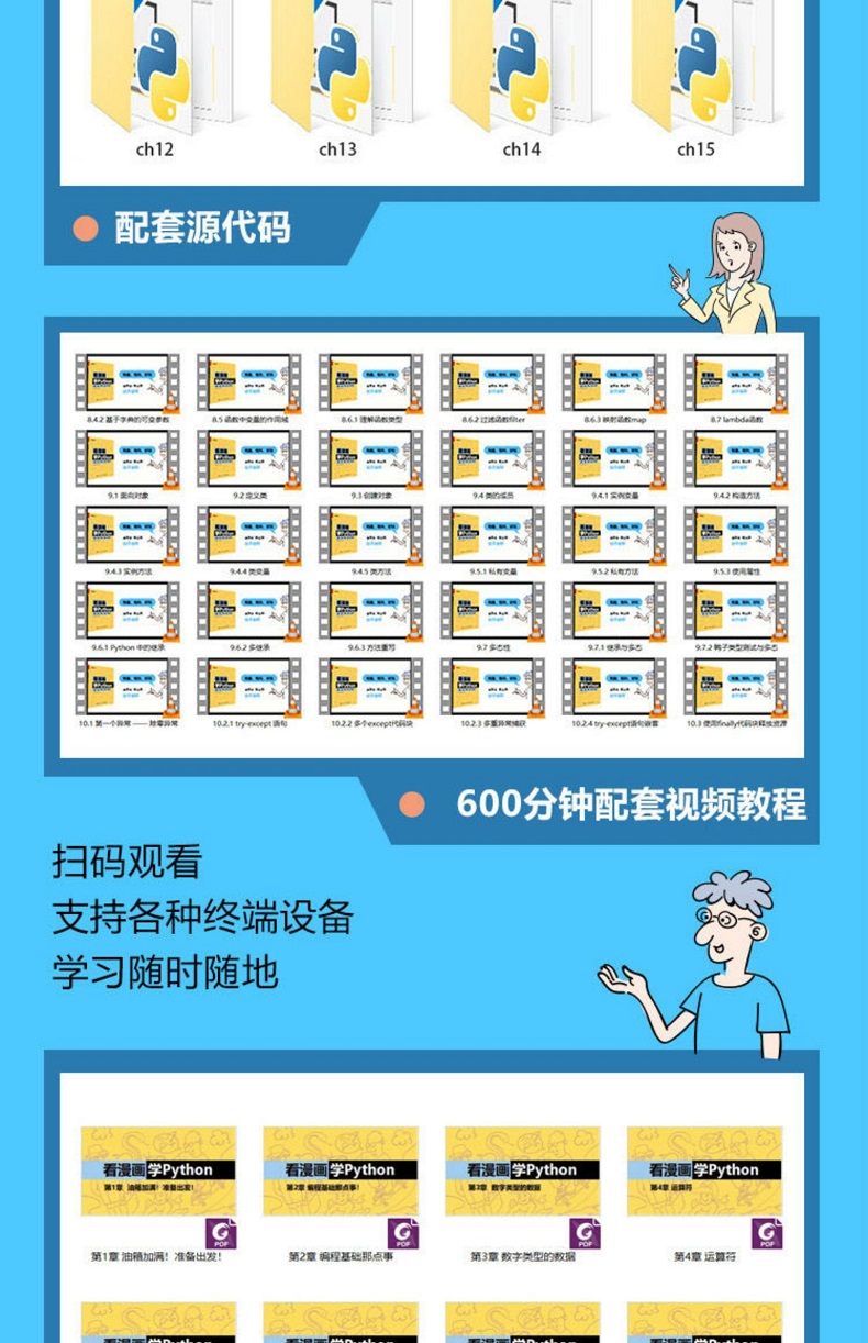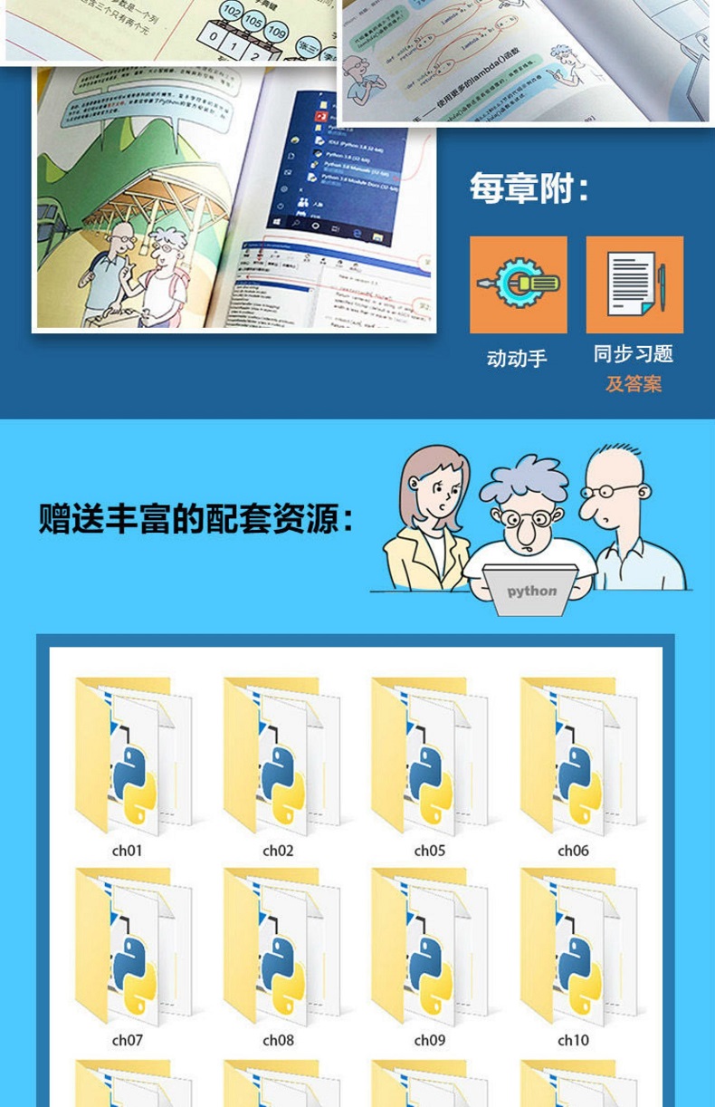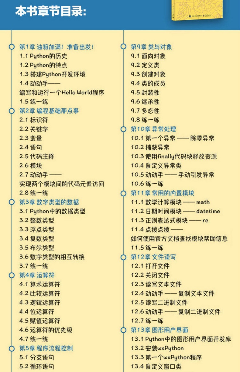 《看漫畫學Python:有趣、有料、好玩、好用(全彩修訂版)》在每一章中都安排了「動動手」環節,您可在該環節找到應用實例;在每一章結尾都提供了「練一練」環節,您可在該環節找到同步練習題。