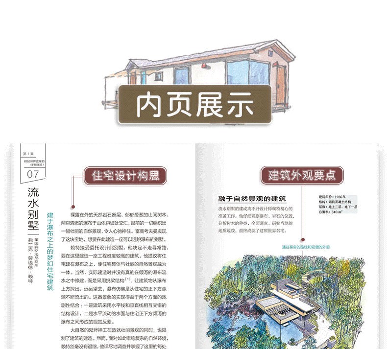 本書介紹了60多座世界著ming的住宅建築,包括31座掀起世界變革的住宅建築、15座日本經典住宅,以及9種紮根當地環境的住宅,卷末集錦則介紹了日本建築發展歷程中11種建築的由來。此外,本書的建築家專欄收錄了22位建築大師的簡要介紹。書中先對住宅進行總體介紹,然後分別就其具體的設計精彩之處進行解析,還搭配了平面圖,分析住宅內部格局的佈置,以供讀者參考。本書圖片採用手繪形式,圖文精美,文字精煉,可閱讀性較強。通過圖文對照,讀者不但可以看得見此住宅的內外設計,還可以感受到居住在其中的人文生活。