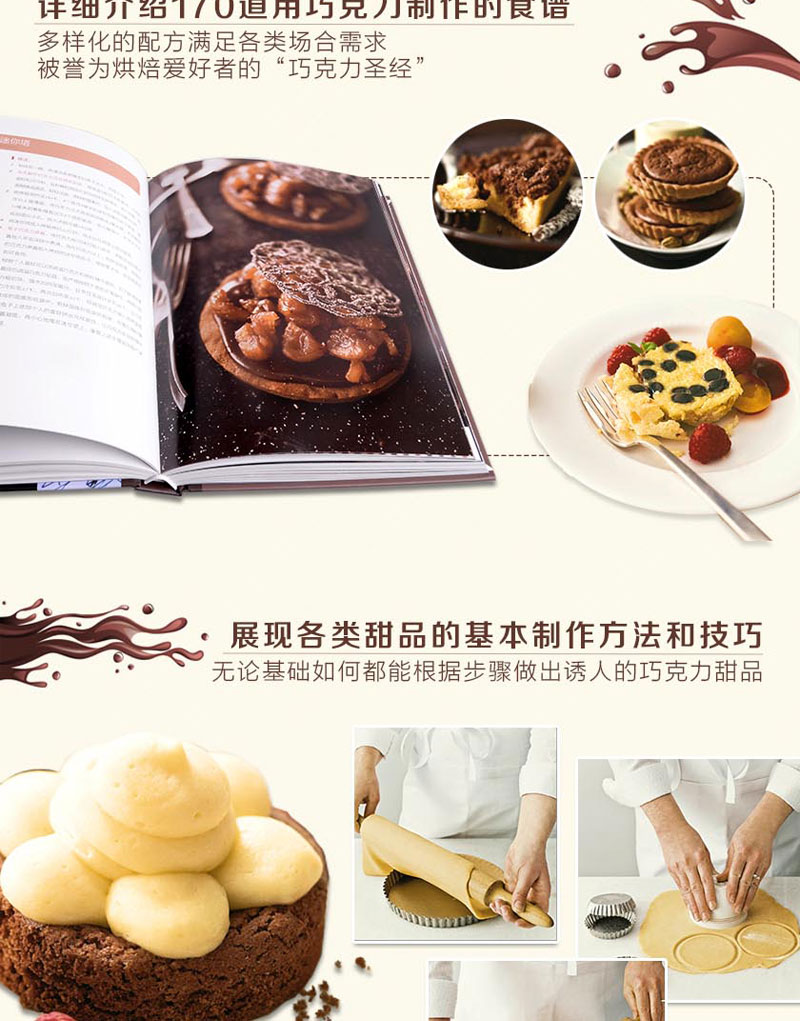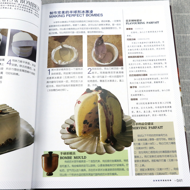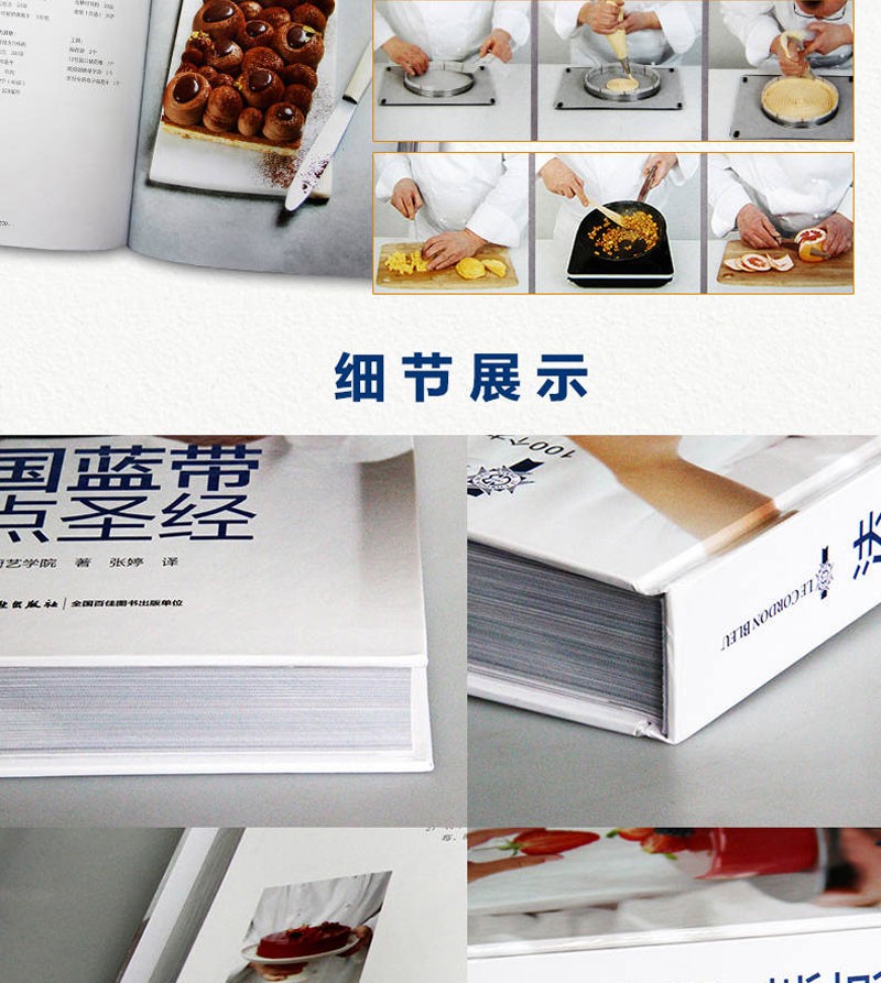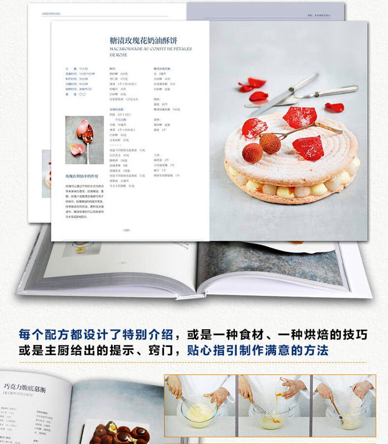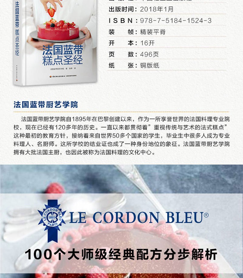 書中甜品突出法國藍帶廚藝學院特有的精緻裝飾和出眾技藝,單獨列出的參考部分則涵蓋製作麵糊、蛋白霜、沙司,以及加工水果、巧克力調溫、蛋糕裱花等所有基本技法。