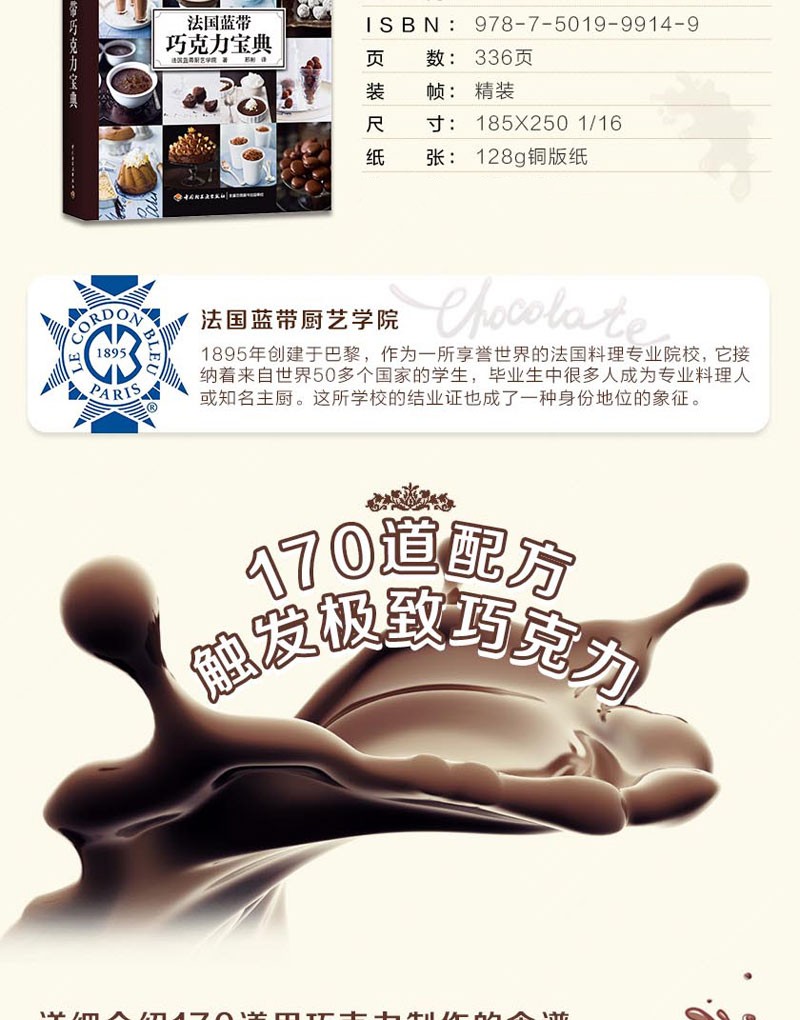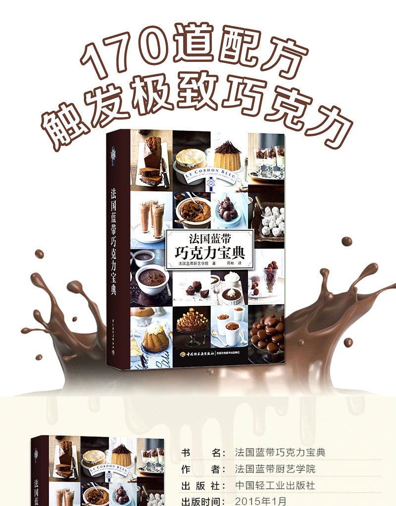 《法國藍帶巧克力寶典》介紹170道以巧克力製作的食譜,包括各種巧克力甜品的基本製作方法和技巧。本書步驟圖完整,文字介紹詳盡,一步一圖。本書為法國藍帶廚藝學院經典的巧克力教材,是指導學習製作巧克力美食的指南、寶典,以全面、經典被譽為“巧克力**”