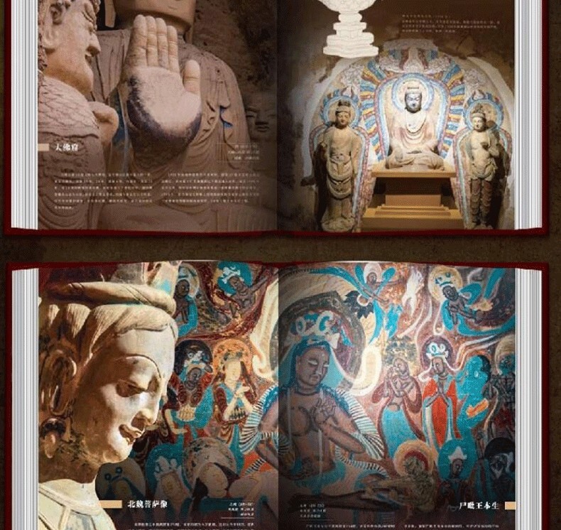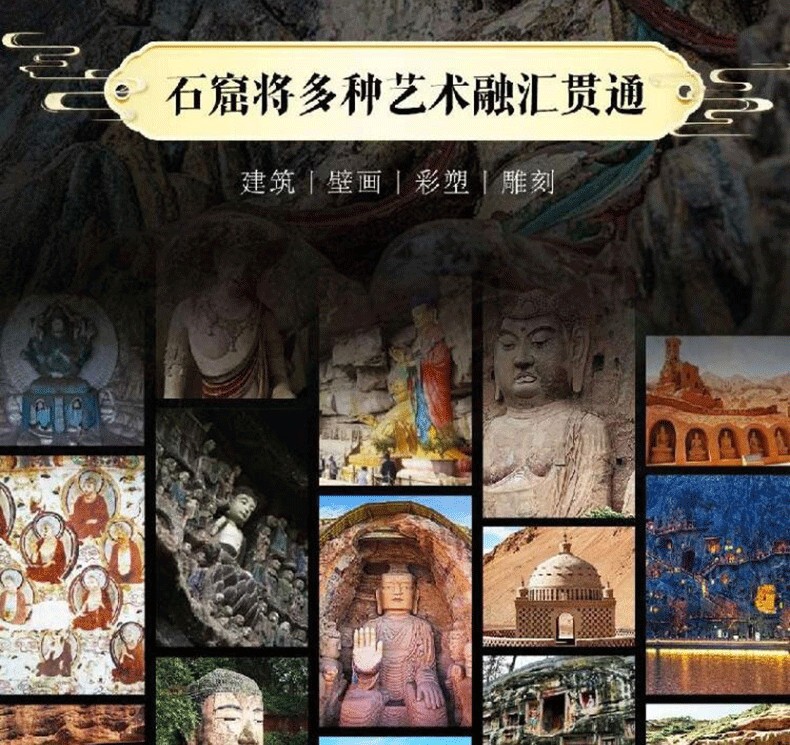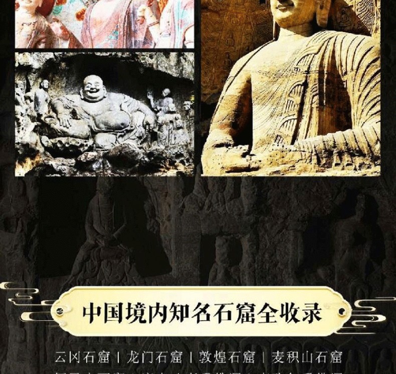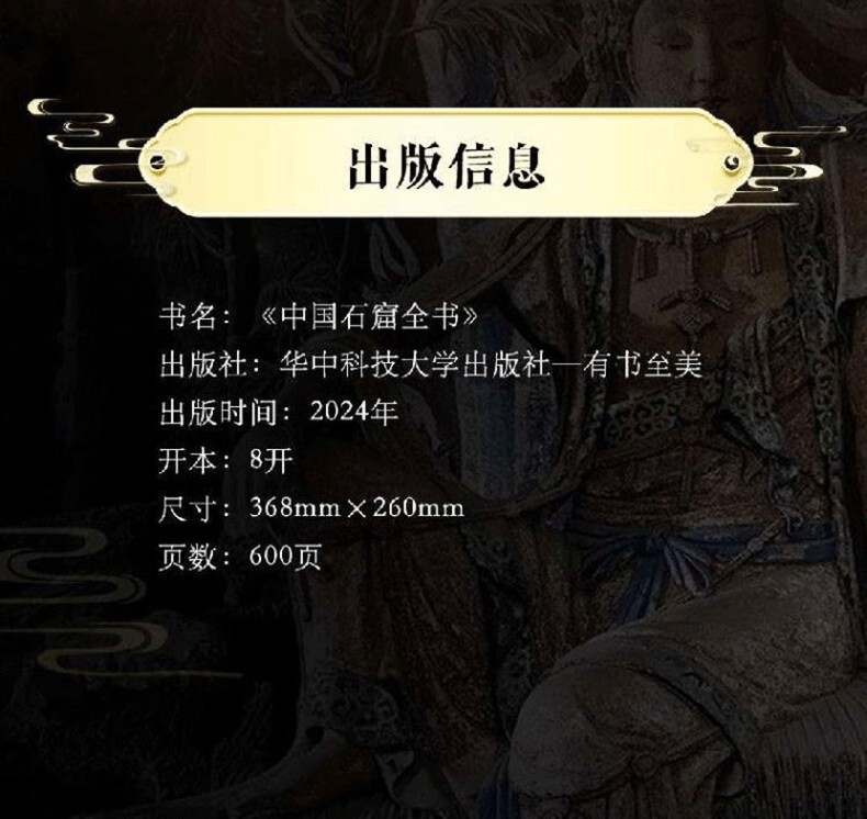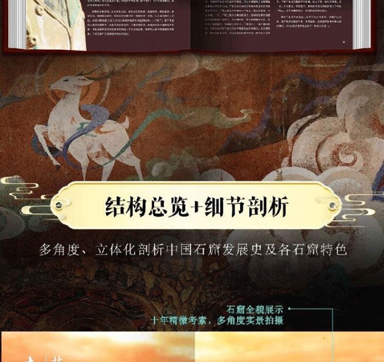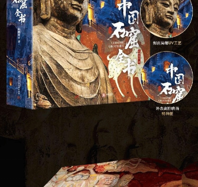 《中國石窟全書》,書中主要描述了中國石窟藝術的發展史,並舉例介紹極具民族特色的中國石窟藝術。書中以石窟藝術作為載體,詳細描繪了中國石窟藝術的綿亙千年歷史,此外,還囊括了富麗多彩的石窟壁畫,含佛經故事、山川景物、亭台樓閣等建築畫、山水畫、花卉圖案、飛天佛像以及當時勞動人民進行生產的各種場面等,是十六國至清代1600多年的民俗風貌和歷史變遷的藝術再現,雄偉瑰麗。