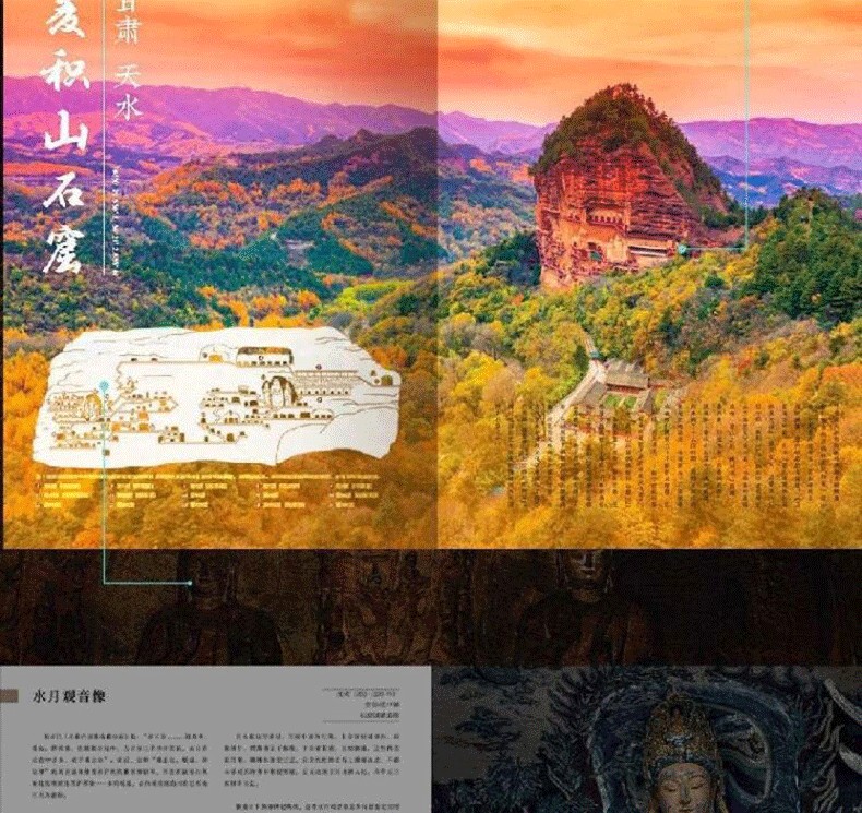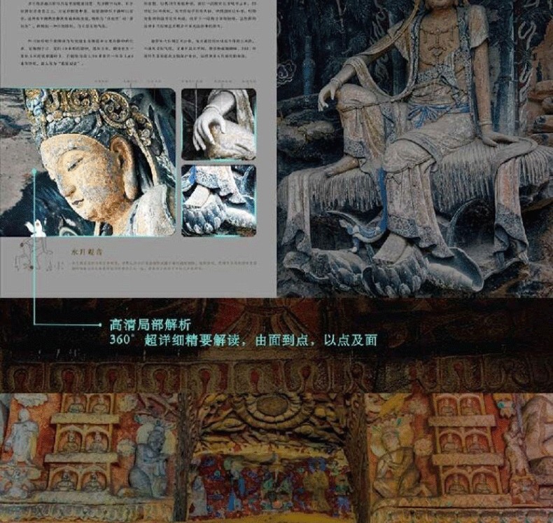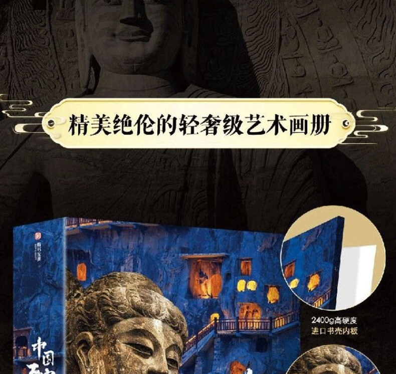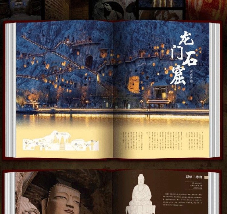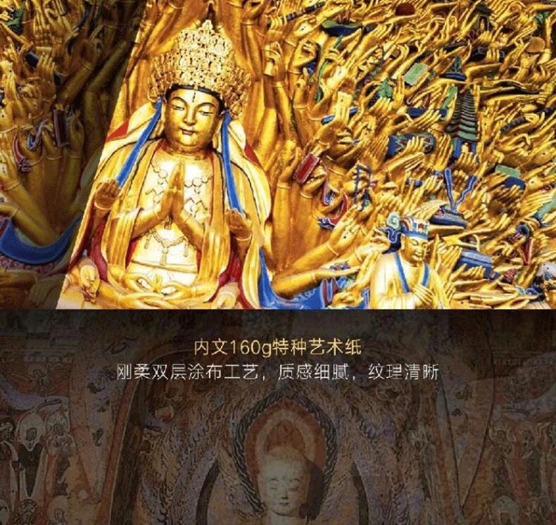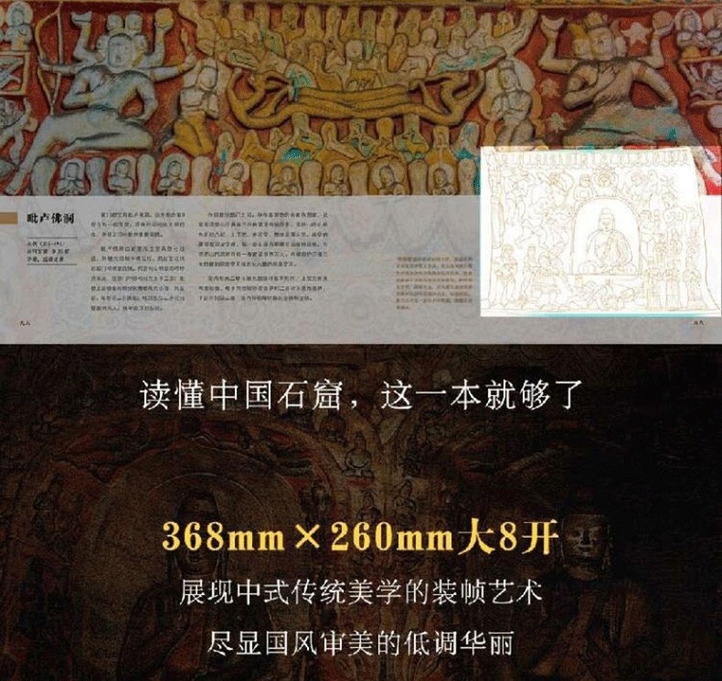 《中國石窟全書》,書中主要描述了中國石窟藝術的發展史,並舉例介紹極具民族特色的中國石窟藝術。書中以石窟藝術作為載體,詳細描繪了中國石窟藝術的綿亙千年歷史,此外,還囊括了富麗多彩的石窟壁畫,含佛經故事、山川景物、亭台樓閣等建築畫、山水畫、花卉圖案、飛天佛像以及當時勞動人民進行生產的各種場面等,是十六國至清代1600多年的民俗風貌和歷史變遷的藝術再現,雄偉瑰麗。